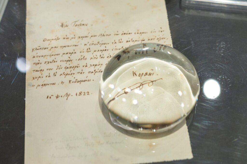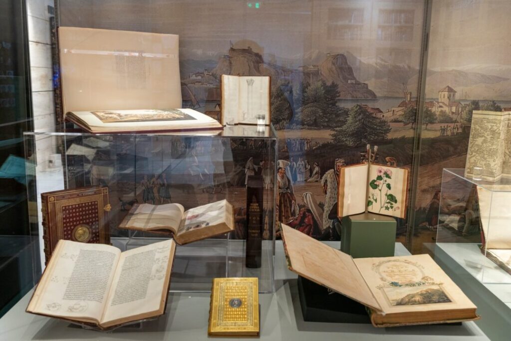 Die ausgestellten Objekte bieten den Besucherinnen und Besuchern die Möglichkeit, eine Welt zu erkunden, in der Geschichte, Kunst und Forschung nebeneinander bestehen. Von Materialien, die die Entwicklung des Hellenismus von der Antike bis in die Gegenwart nachzeichnen, über persönliche Archive bedeutender Persönlichkeiten bis hin zu seltenen historischen Karten des östlichen Mittelmeerraums entfaltet sich ein vielschichtiges Panorama, das sowohl die Geschichte der Bibliothek als auch den weiteren Verlauf des Hellenismus selbst erzählt.